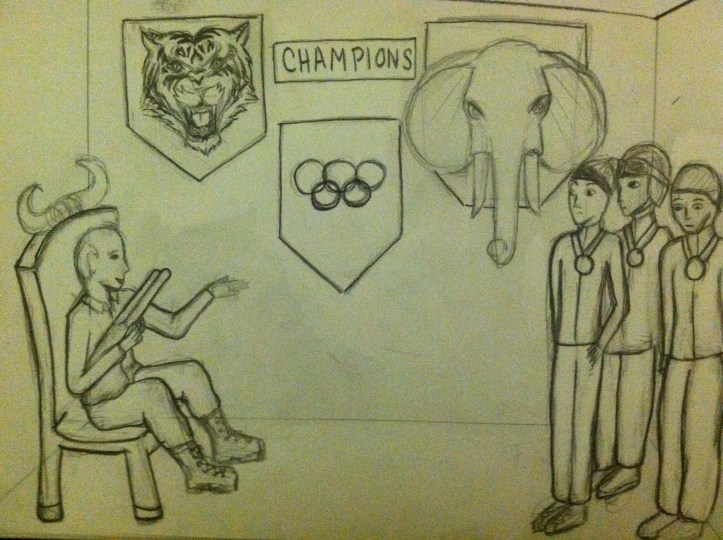 He entered the room, his ursine companion at his heels, and continued. “Look upon my walls. I have hunted every beast imaginable, even the majestic relatives of Chekhov here.” Putin stroked the bear affectionately. “But something is missing from my trophy room. My collection would not be complete without the most dangerous game of all: man. Since Olympic athletes represent the apex of the physical human form, you will make for a truly legendary hunt. My associate will release you into the woods, where you will have a ten minute head start before I come for you. The last standing among you will be let free to live with the glory of having beaten the world’s greatest hunter.”