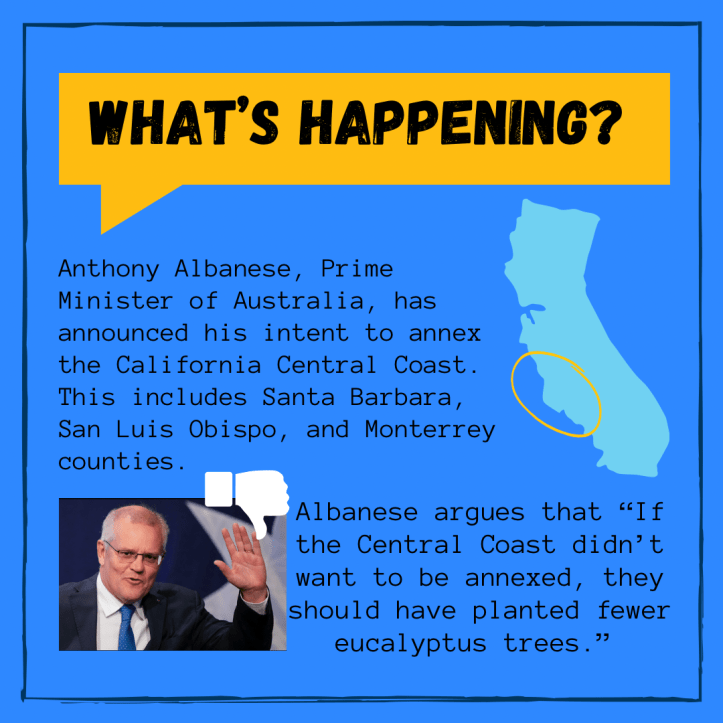 Anthony Albanese, Prime Minister of Australia, announced yesterday that the Commonwealth of Australia intends to annex the Central Coast of California. “Though the cost of implementing governance overseas is high,” he said, “the benefits of an Australian presence in North America cannot be overestimated.”