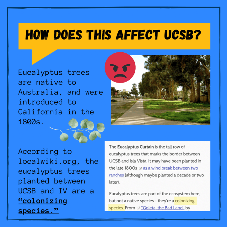 “Eucalyptus trees are an invasive species that do nothing but choke out native plants and animals,” the statement reads. “According to one article about UCSB’s trees, they are classified as a ‘colonizing species.’ Our only option is to dismantle the eucalyptus institution from the ground up.”