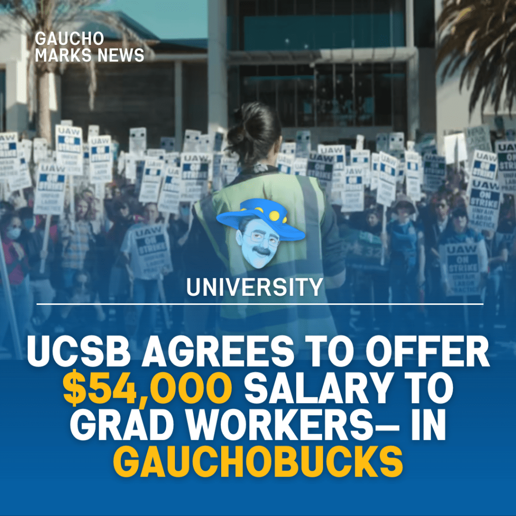 At 3:30 AM this morning, the UC Regents convened to present the UAW 2865 Student Workers with a final offer to stop the ongoing strike before finals week. In “accordance” with COLA (Cost of Living Adjustment), it has been proposed that the UC will give not a 5% raise, not an 8% raise, but a whole heaping fifty-four thousand buckaroos a year to its academic student workers… to be paid out in non-refundable “Gauchobucks.”